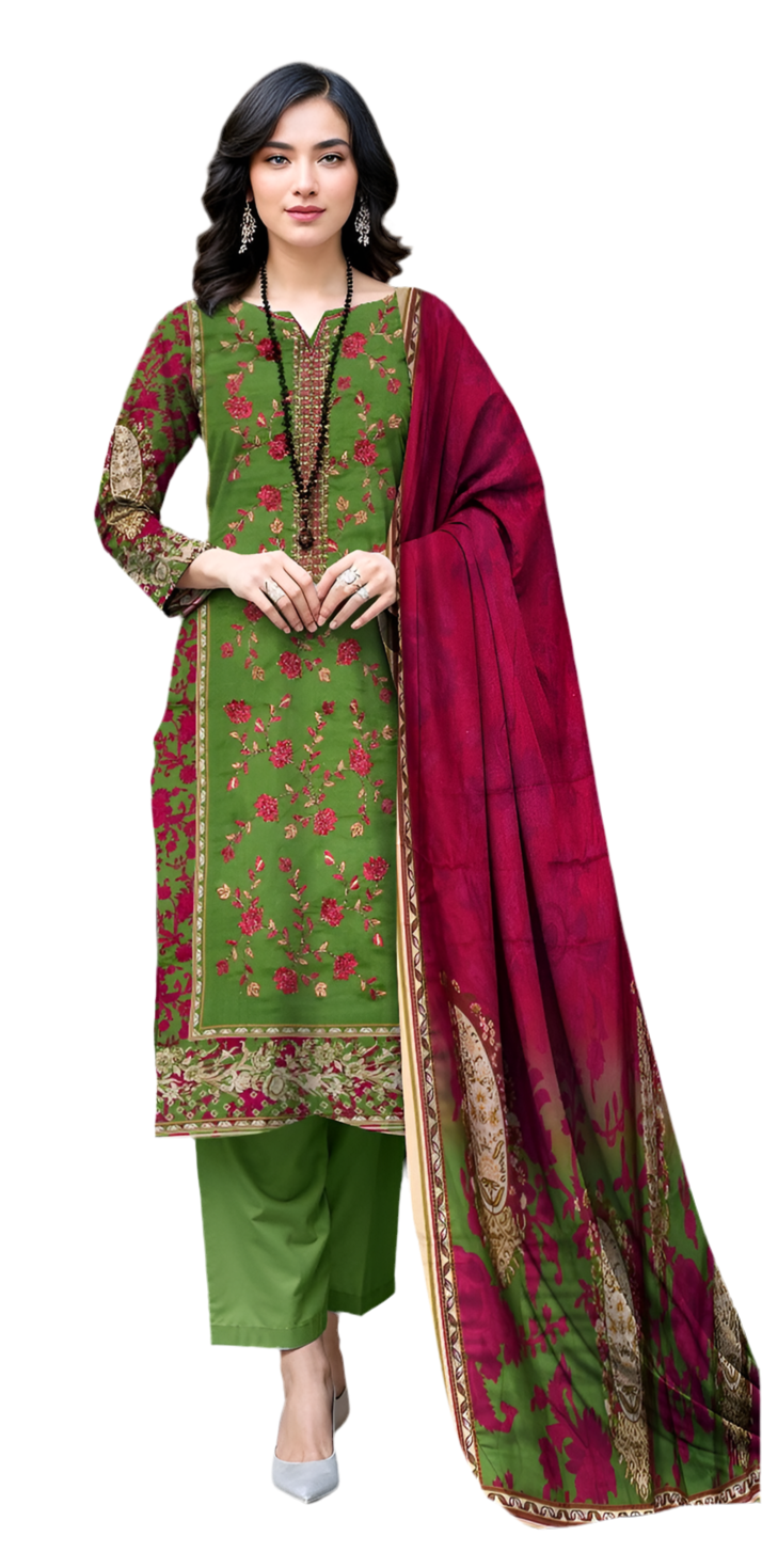 2-piece stitched suit in pistachio green with oversized floral print—straight kurta + straight trouser. Lightweight, breathable; ideal for everyday wear.