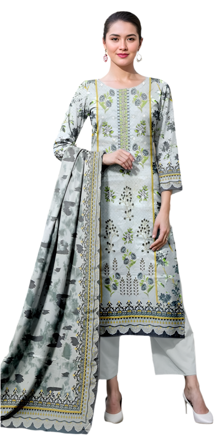 2-piece stitched suit in pistachio green with oversized floral print—straight kurta + straight trouser. Lightweight, breathable; ideal for everyday wear.