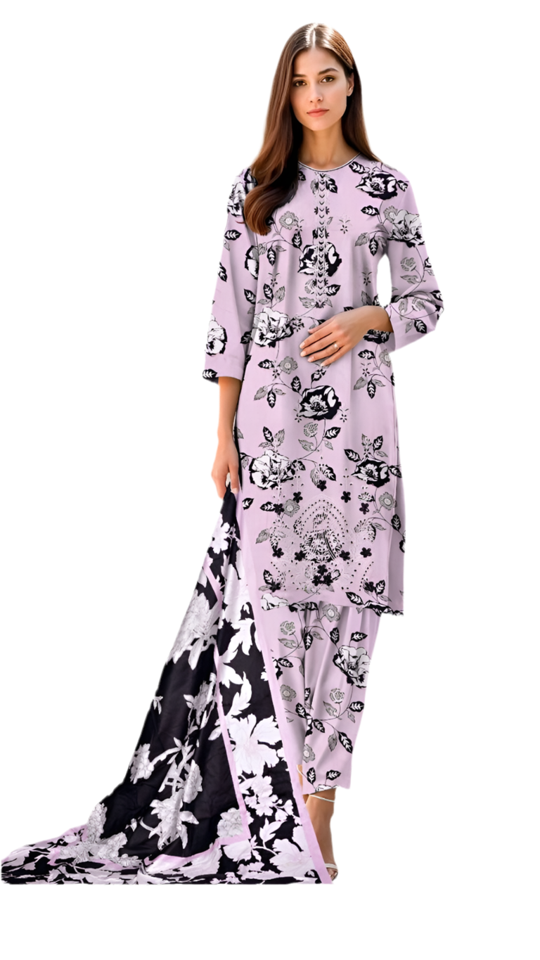 2-piece stitched suit in pistachio green with oversized floral print—straight kurta + straight trouser. Lightweight, breathable; ideal for everyday wear.